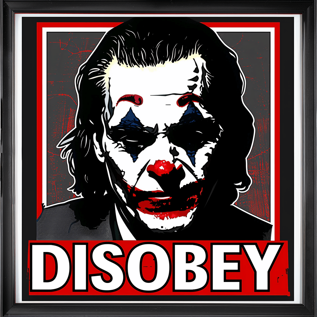 Dit krachtige kunstwerk toont een iconische interpretatie van de Joker, de beruchte antiheld, in een rauwe, street art-stijl. Met de opvallende boodschap “DISOBEY” roept het beeld gevoelens op van rebellie, vrijheid en het doorbreken van maatschappelijke normen. De combinatie van felle rood-, zwart- en wittonen en de intense blik van de Joker maakt dit een visueel statement dat niet onopgemerkt zal blijven.