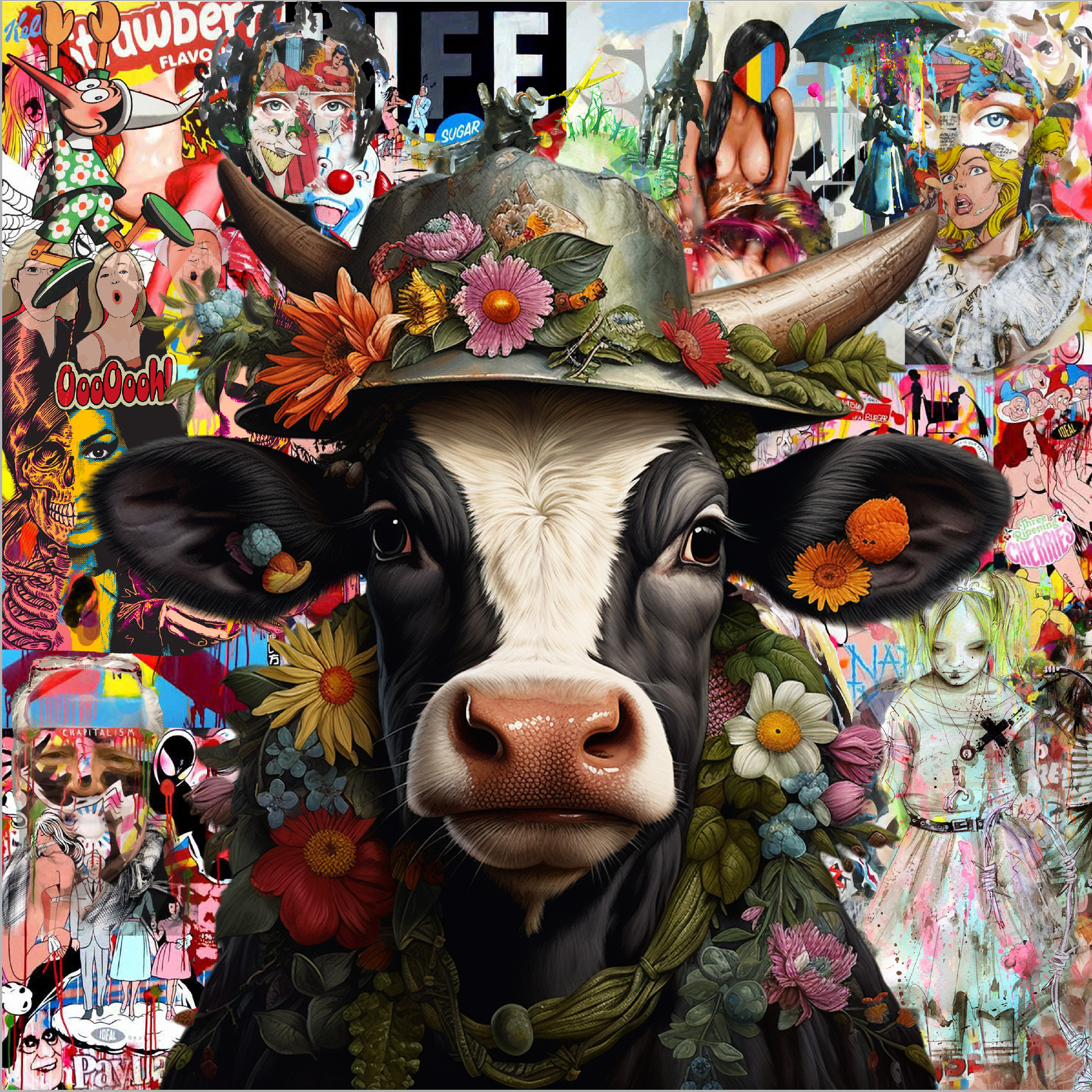 Cowparade – Blossom Guardian – Een waardige hoeder omringd door een kringloop van levendige verhalen.