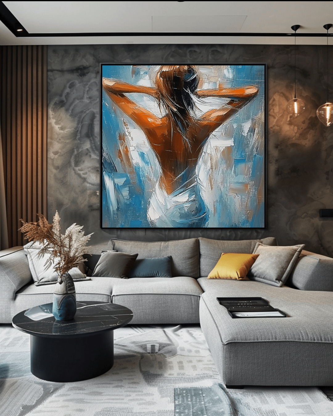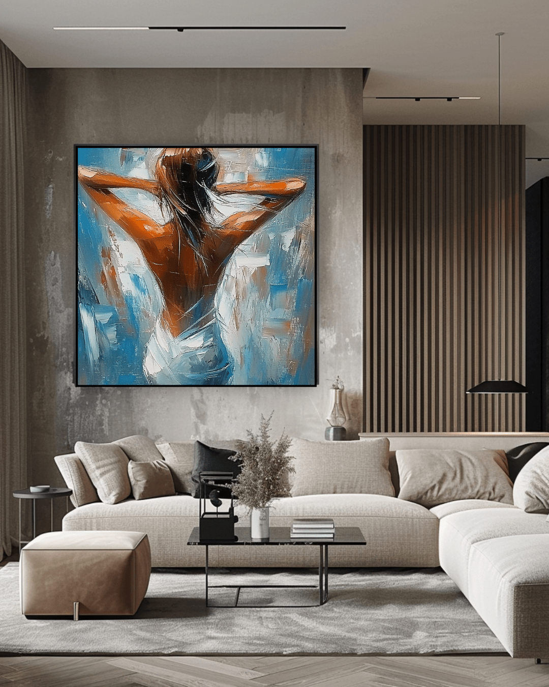 In dit schilderij zien we een vrouw die haar rug naar de kijker keert, terwijl ze haar armen achter haar hoofd vouwt in een ontspannen, zelfverzekerde houding. Haar figuur straalt kalmte en sensualiteit uit, en de zonlichtaccenten die op haar huid vallen benadrukken haar natuurlijke schoonheid. De abstracte penseelstreken in blauwtinten en warme oranjetinten geven een gevoel van beweging en de overgang van nacht naar dag. De ruwe, expressieve texturen suggereren een moment van reflectie en sereniteit, vastgelegd in het intieme spel van licht en schaduw.