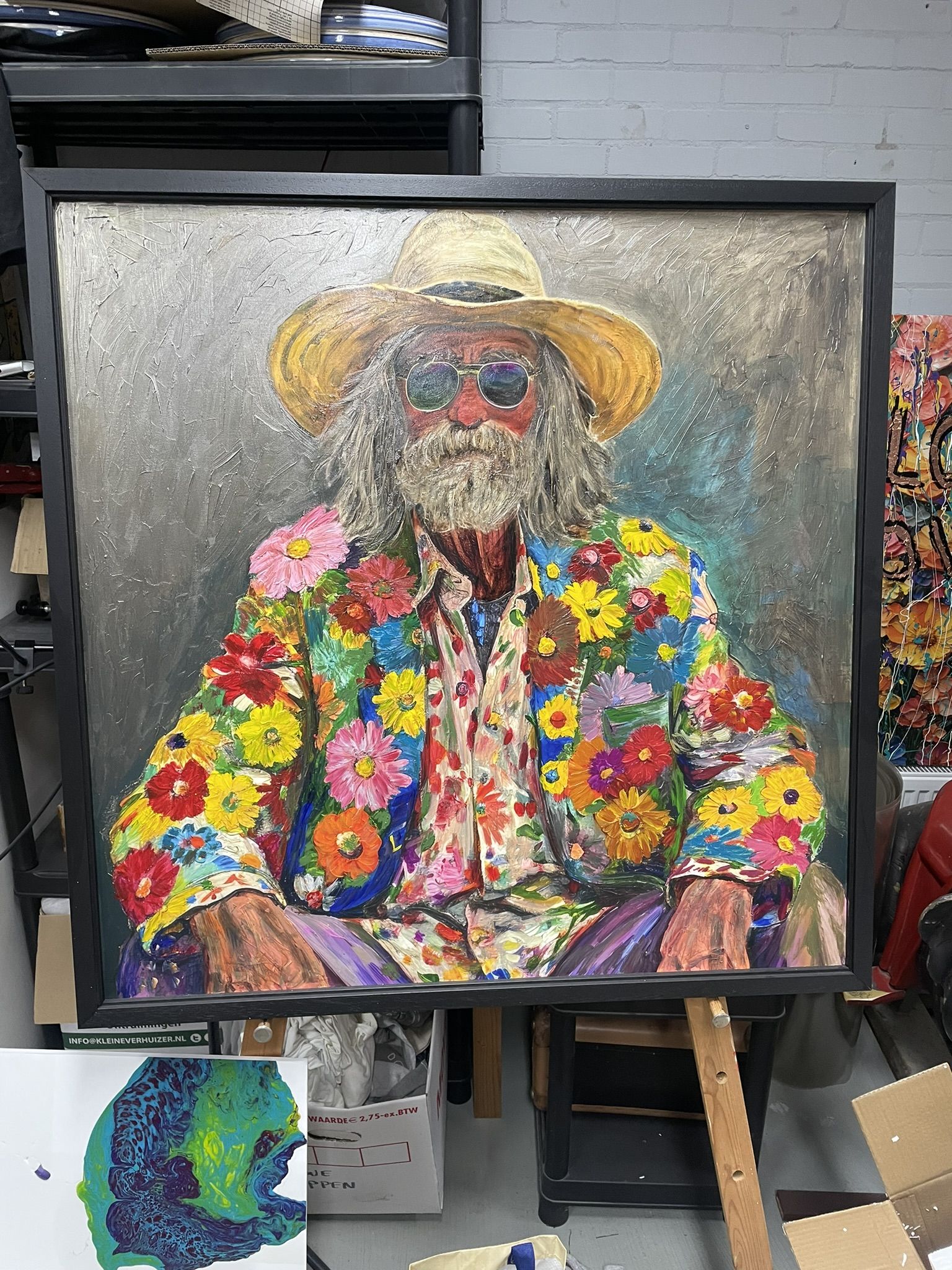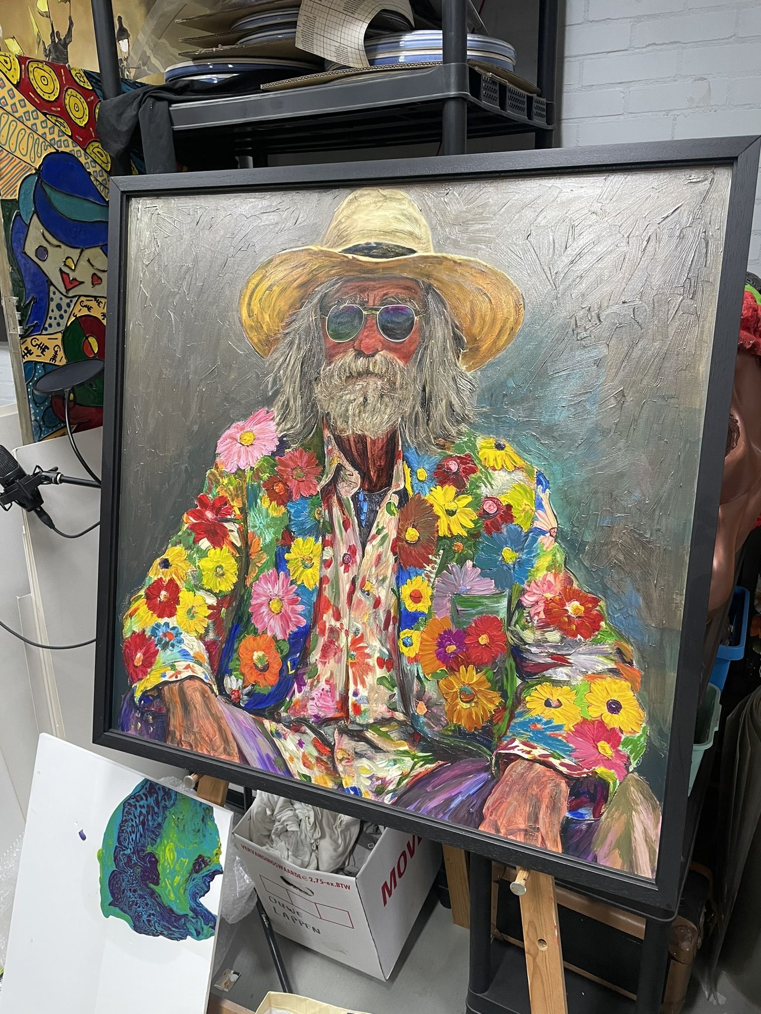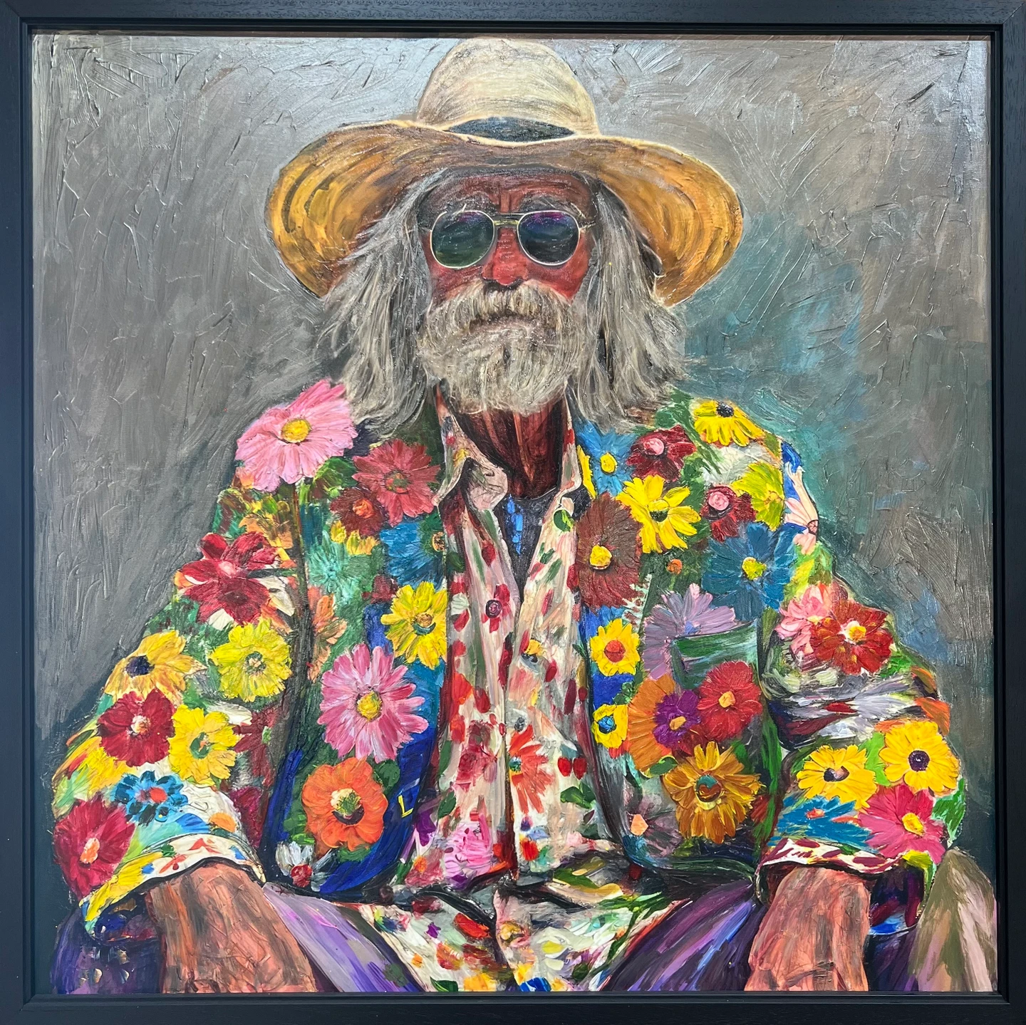 “Grey Wolf” is a poignant mixed media painting that captures the contentment of an old hippy man, immersed in his own world of peace and happiness. The central figure, with his distinguished grey beard, serves as a testament to wisdom and the passage of time, while his demeanor radiates a profound sense of self-acceptance and joy.