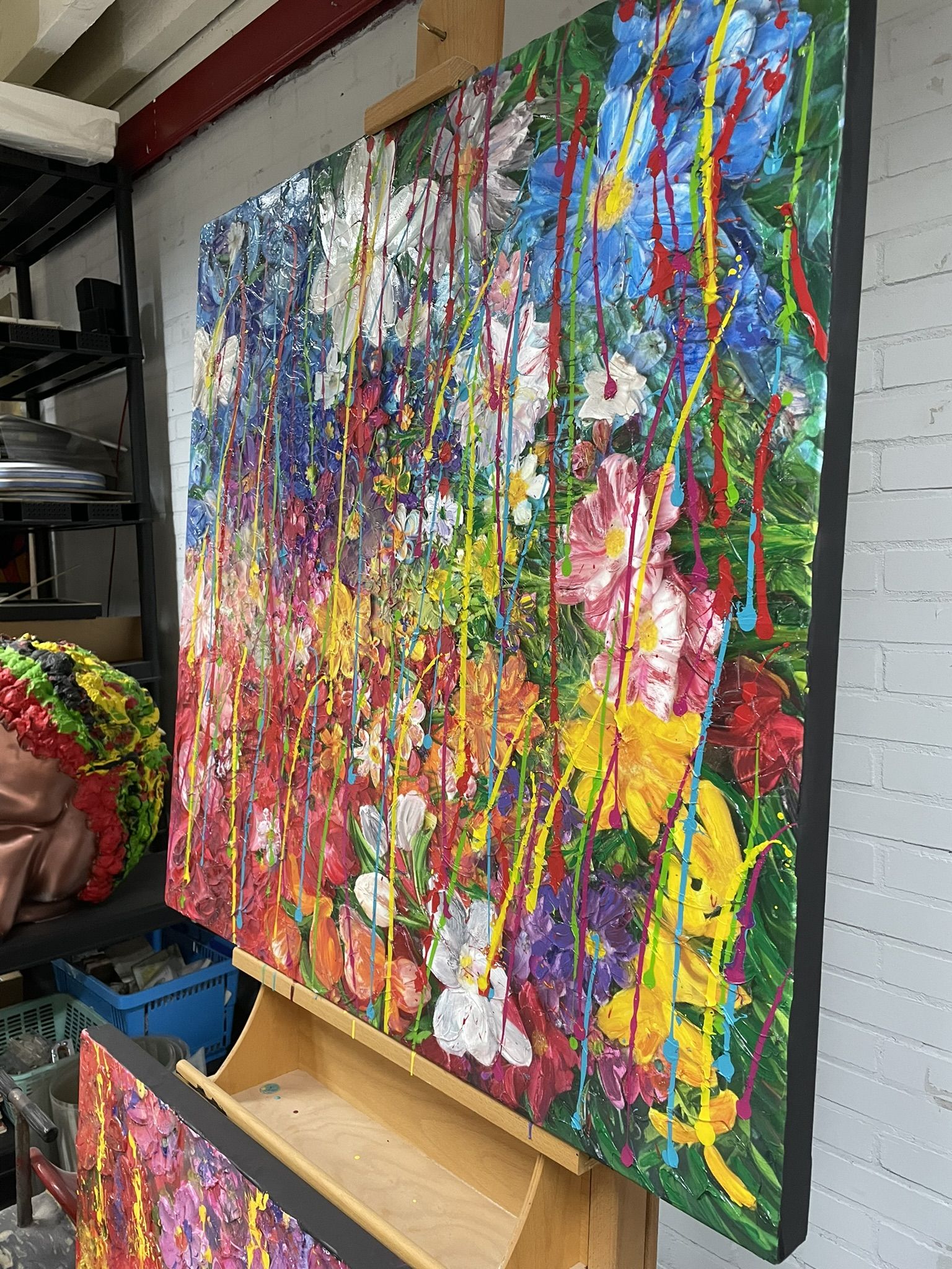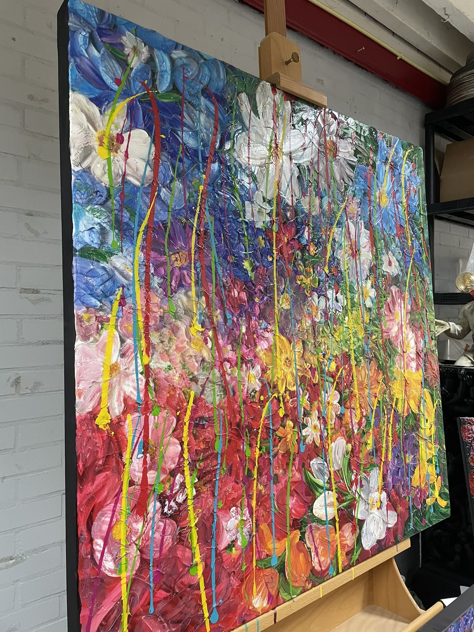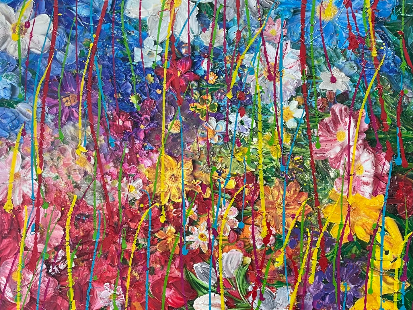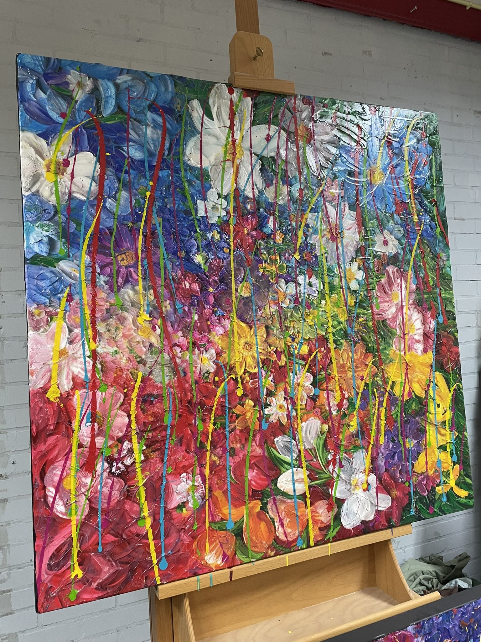 “Zig Zag Cherry” is a dynamic mixed media painting that bursts with vibrant energy and color, making it a truly eye-catching piece. The painting’s palette is a riot of colors that seem to leap off the canvas, enhanced by literal splashes of paint that add an exciting, spontaneous feel to the artwork.